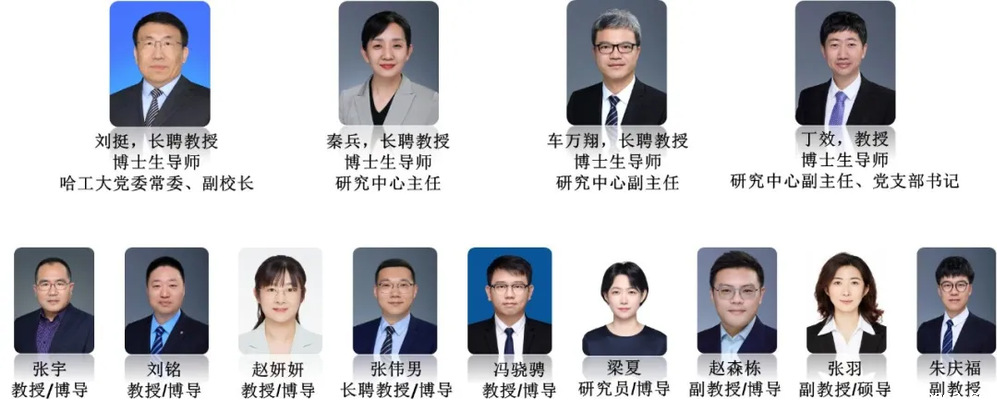 研究中心教师包括:哈工大党委常委、副校长刘挺教授/博导,研究中心主任秦兵教授/博导,副主任车万翔教授/博导,副主任丁效教授/博导,教师张宇教授/博导、刘铭教授/博导、赵妍妍教授/博导、张伟男教授/博导、冯骁骋教授/博导,梁夏研究员/博导,赵森栋副教授/博导、张羽副教授/硕导和朱庆福副教授。