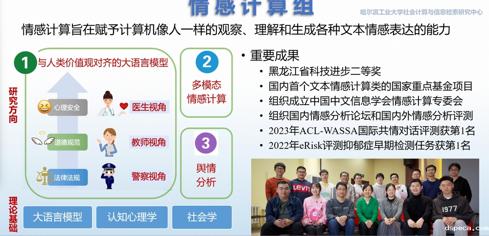 文本情感计算是通过文本分析研究情感理解的关键核心技术,是人工智能领域中的重要研究方向。 该技术有助于提高社会舆情与产品口碑分析系统的性能。 文本情感计算小组的研究任务包括:情感计算的基础任务(情感分类与情感信息抽取等)、多模态情感计算、面向对话的情感计算以及面向社交媒体的情感计算等。 该方向得到了国家973计划、国家自然科学基金重点项目以及多家知名企业的资助,具有重大的社会效益和经济价值。发表包含SCI期刊及顶级国际会议在内的相关论文70余篇,代表性论文单篇他引次数达到700余次。 参加多次国内外知名情感计算评测,均名列前茅。成果形成《语言情感智能分析技术与系统》,2019年获得黑龙江省科技进步二等奖。